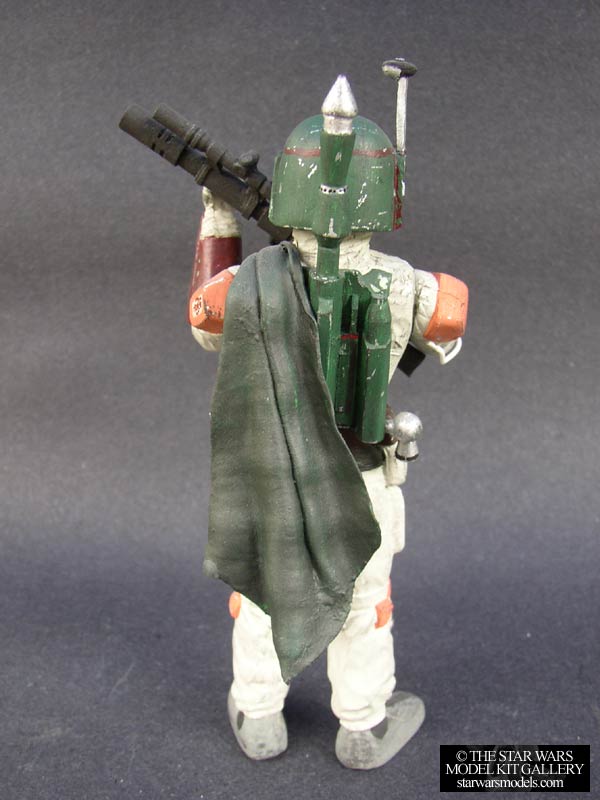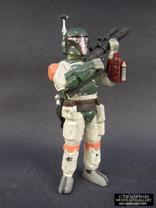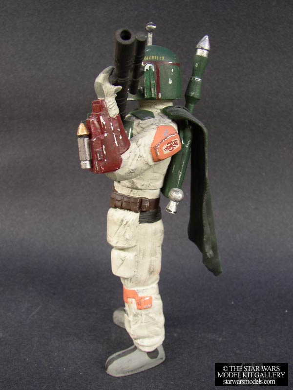 | This funny looking piece is the companion kit to the two Stormtroopers also by Red Baron. The box says "BobaFeet". I guess this is to avoid legal troubles. This kit, like the others, was cleanly cast in green resin. There were very few parts. Basically just the head (a bit squat if you look at it), torso, arms, gun, jet pack and cape. I painted this kit before I assembled it. This is usually what I do with figure kits. I started by spraying all of the pieces with armor and the backpack a shiny silver enamel. I then masked off these metal sections and sprayed the rest of the kit with Flat Light Aircraft Gray. This is the under suit. I then painted all of the armor sections with a soft acrylic Hunter Green. I then followed through painting the rest of the kit in the appropriate colors. The orange and red parts are difficult because you have to mix colors for them. When this was all done, I did my standard scratch technique to simulate Fett's battle damage. I then followed through with dry brushing for the rest of the weathering. I hand painted the logos on his chest and shoulder. I had to scratch build his antenna because my kit was missing his. I used some spare parts. I can't even remember what the heck they were. After painting I glued everything together. The only trouble I had was getting the arms to line up properly to hold the gun. Other than that it was pretty straightforward. I glued the cape at an angle that kind of gives it the appearance of blowing in a slight breeze. I got this kit from my good friend Jason at Endless Models for $50. |