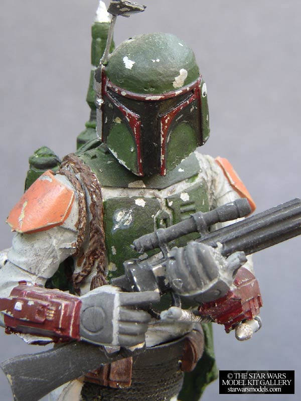 This was another awesome Fett kit by Kaiyodo as part of the 1/15 Scale Resin Cast Kit Collection. This was mostly resin except for some metal pieces like the rocket, gun, gauntlet parts, rangefinder stalk, and the exhaust nozzles. The small scale really makes it look neat. The position is nice as well. He seems a little more menacing with his gun pointed upwards. I used my standard metal scratch technique on this kit as well. Other than that it was pretty standard. I used my regular Fett paint scheme on this. This kit cost me around $20 on eBay. | ||||||||||||||||||||||||||||