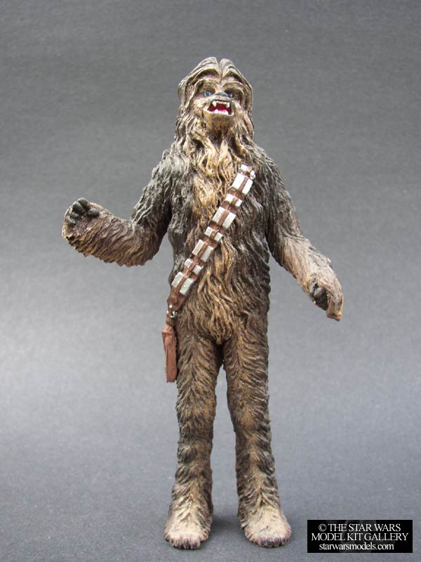 This is the smaller of the two Chewbacca kits that I own. It is a part of the 1/15 Scale Resin Cast Kit Collection by Kaiyodo. Surprisingly there are very few kits of Chewbacca available. Polydata had one lined up but never released it. I had heard that it will be released as a resin kit by a garage company, but have yet to hear anything more. I think this kit had like 3 or 4 pieces. The arms, bag and rest...so construction was simple. The hardest part was making the seams look natural. I based it in a dark brown, almost black. I then dry brushed increasingly lighter shades of brown and then some gold. I picked out the details and the bandolier and that was it. I'm surprised he didn't come with a gun...rare in a Star Wars kit. I think I paid around $15 or $20 for this. I got all the 1/15 Kaiyodo-type kits from the same guy. | ||||||||||||||||||||||||||||