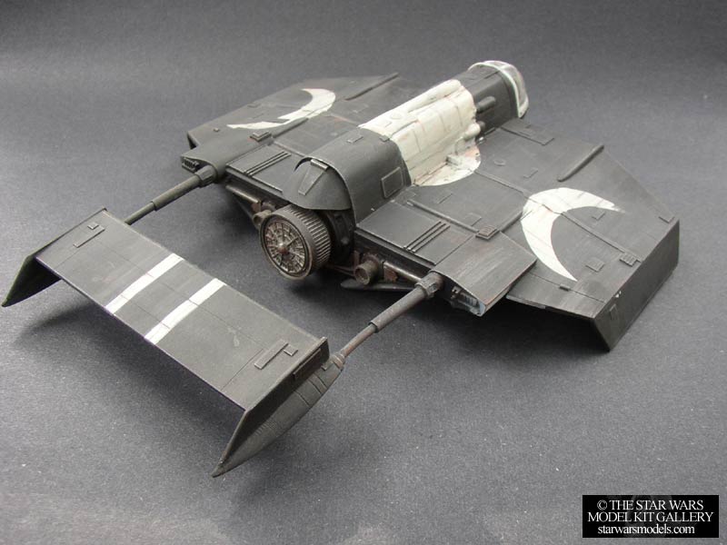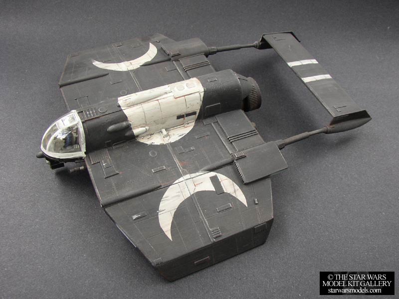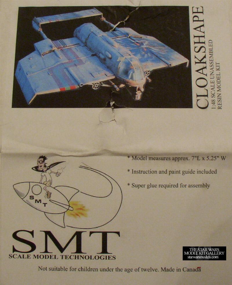 | This is another great kit from SMT that deals with the Expanded Universe. This craft was seen pursuing Han Solo on Nar Shadda in the comic Dark Empire. It has also been featured in numerous Star Wars games as well as books. Alfred Wong took this material and made it into a really cool kit that stands out from the rest. The detail on this kit is great. I was able to identify several X-wing parts used in the building of the kit and even a 3-liter soda bottle cap for the main thruster engine! The casting is very crisp and well done, as is expected of SMT. Construction was very simple. There weren't too many small parts to fumble with so that was good. One thing that I liked was that the exposed engine areas underneath the craft were inserts that could be painted separately and then inserted. There were no major problems assembling this ship. I had a little trouble aligning the tail fins right, but that's not big deal. Unfortunately the cockpit canopy doesn't fit exactly right so that took a little working, but again it was a minor problem. I had a few copies made out of clear styrene by my friend Mark from Zarkus Model Kits so I was able to experiment with these. He offered to make me these copies because the original from SMT was made of clear resin and was foggy. I put a lot of work into the cockpit area so I wanted it visible. Speaking of that, on to painting. If you can see, I made the pilot alien. I was tired of doing humans so I made a greenish-blue skinned dude with red eyes. A real pirate looking guy since the Cloakshape is often used by mercs and pirates. I decided to paint the ship black because I don't really have too many all black ships and I thought it would look cool. It seemed logical for the subject matter. As for the big logo emblazoned across it, I originally wanted searing flames around the sun area in the center, but that proved too difficult. The rest wasn't too hard. I added some more white accents around the ship in the forms of stripes and then weathered the ship heavily with grays, blacks and rust. Unfortunately a lot of it is hard to see in this picture, oh well. I got this kit directly from SMT for a special price that I can't mention. ;) Unfortunately this kit is no longer available as SMT has ceased production of all Star Wars related kits. | ||||||||||||||||||||||||||||