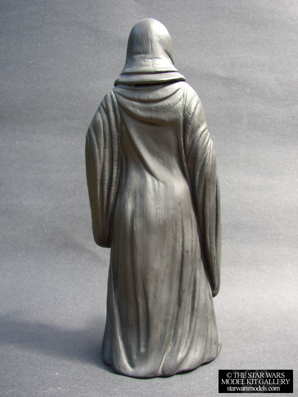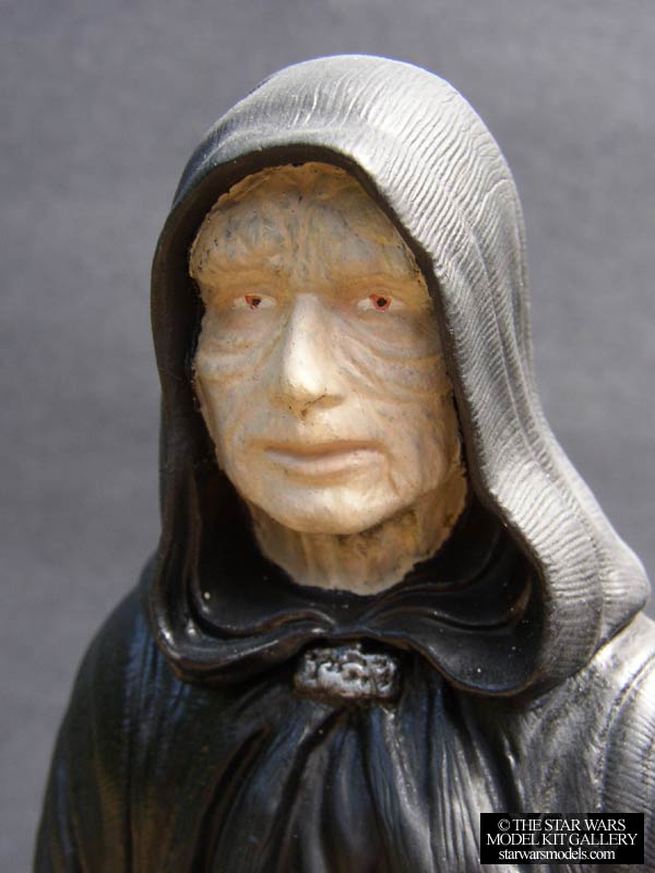 This vinyl kit was released by AMT/ERTL as part of the Shadows of the Empire line along with Xizor and his Virago. I spoke to the sculptor of this kit and he wished that he could have done a different pose. I think it is pretty neat. It's the only kit I've ever seen of the Emperor, which is surprising! He's so cool. Construction was simple, very few parts. You actually have a choice of left hands. The other one is more of a closed and pointing one. I chose the open one because it seemed more natural for him. I spray painted him flat black for the cloak. I then painted his cane gloss black and dry brushed the clasp in silver. I painted his skin with a really light tan color to simulate his dark side deteriorated visage. I picked out some details with a nasty pinkish color to make him even more gross. I got this kit off eBay for less than $10. |