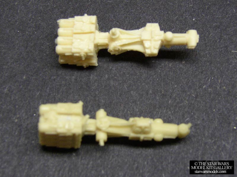 This little Rebel Blockade Runner (or Tantive IV) is intended to complement the ERTL Star Destroyer by fitting up inside the main hangar bay of the kit. Released by Arvey Model Products, this one piece kit is well cast and full of small scale detail. You get two per package so one can be stuck in the hangar bay while the other can be built as a separate kit. No assembly is necessary so no instructions are included. However, a useful painting guide is included to help guide you in recreating the Tantive IV. Something like this has been called for by modelers for a long time. It's nice to see something finally be released. This kit is available directly from Arvey Model Products for $18. | ||||||||||||||||||||||||||||