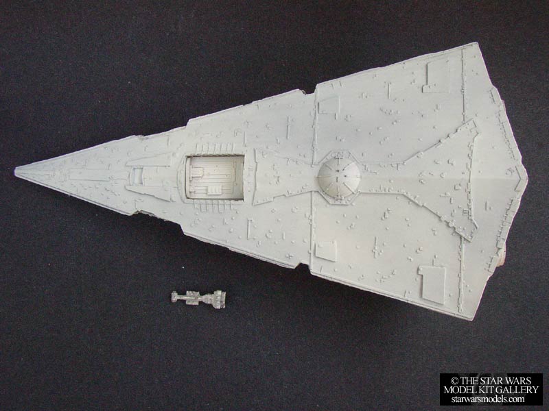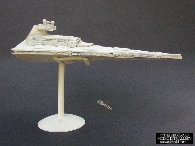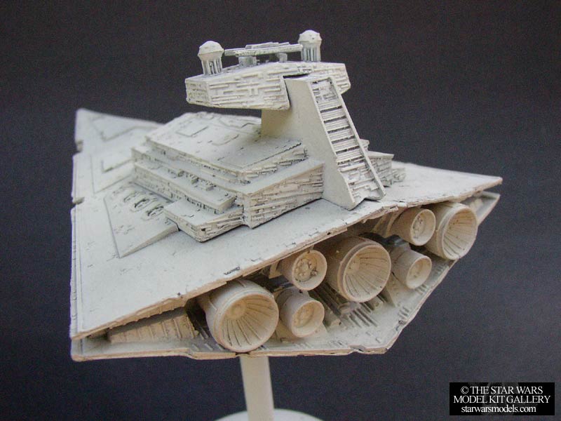 This by far the most accurate Star Destroyer kit available. For such a small kit, the amount of detail is amazing. It is crisp, accurate and looks darn good. It's really a shame Argonauts didn't continue with Star Wars models. Construction on this kit was not difficult. There were only a few pieces, the main hull halves, the superstructure was broken down into a few main assemblies, and then the detail pieces like the engines, domes etc. Everything went together really well except for the main hull halves. I had a little trouble getting them aligned properly so be careful with yours. You may need to use a little heat to soften the parts and clamp them in place. Painting was very simple, the kit was based in a dark gray and then light sprayed with white. The result was a white Star Destroyer with some gray showing through giving a nice overall weathered effect. You could even use steel wool to wear the white down even more. I got this kit for around $45 from someone who contacted me with one to sell. |
