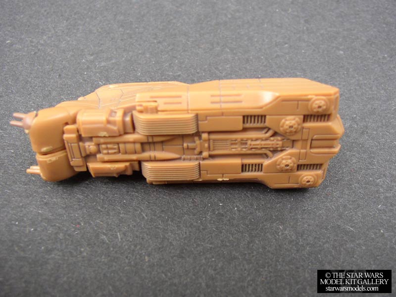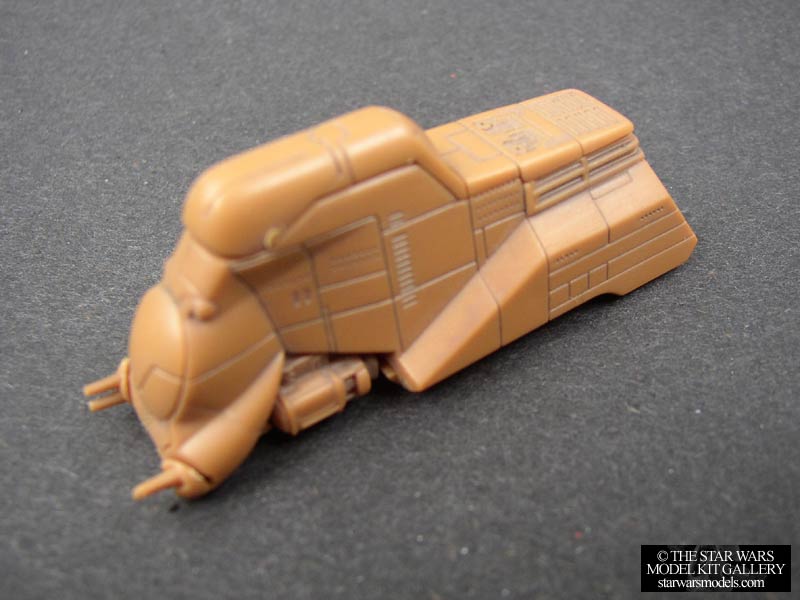 | This is one of the AMT/ERTL mini-models released for Episode One. The box says "Large Transport", but it is probably more commonly known as the MTT or Mobile Troop Transport. This is one of the better mini kits. It snaps together in just a few minutes and is already pre-painted. The painting on this one is great, it even has weathering in the panel lines. The only thing that you should watch out for is the guns in the front of the ship. They may not snap in very tightly, so just use a little glue if you won't be taking it apart again. I got this kit in a lot for the set for just a few dollars. | ||||||||||||||||||||||||||||