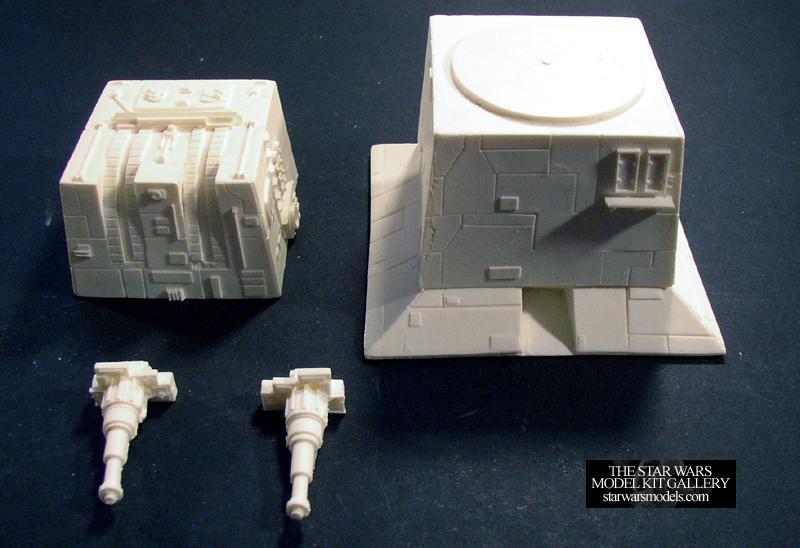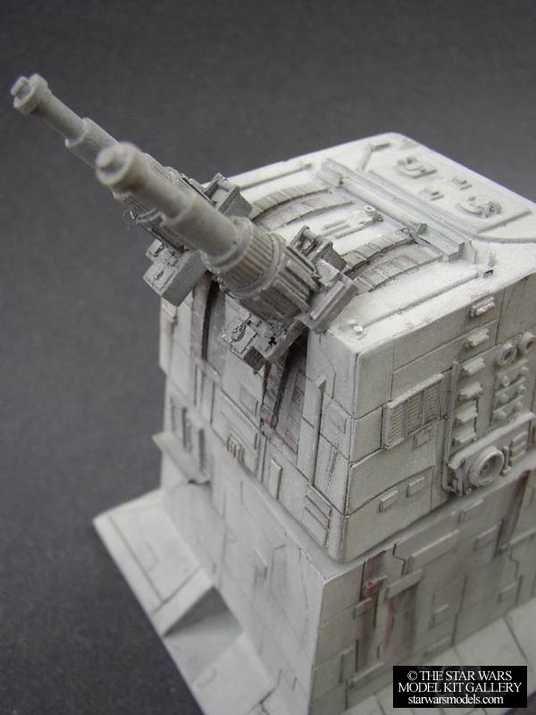 This Death Star Turret is a very unique subject that would look great along with scale ships. Supremely detailed, this kit screamed for some nice weathering. You can also make it so the turret on top rotates around in a circle independent of the base. I like the idea of making a turret into a kit and hope to incorporate it into a display someday. A larger base for the turret was planned but has yet to be released. Assembly was very simple and straightforward. Just some basic cleanup and gluing on the turrets. I also decided to drill a hole in the two halves and insert an acrylic rod into them (but not glue) so the top could rotate as it was intended to. I based the pieces in Light Sea Gray from my airbrush. I put the cannons aside and gave the body sections a light overcoat of Camouflage Gray. I did this because the references I saw made the gun appear as if the turbolaser emitters were a bit darker. After this was all dry I gave the pieces a heavy black wash to bring out the detail. I also added streaks and some dry brushing to simulate further wear. The reference pictures showed that the turrets were pretty dirty and beat up so I tried to replicate that. Once all of the weathering was done I glued on the actual guns in a cool upward "action-like" pose and it was finished. Hopefully sometime in the future the planned base with 3 X-wings will be released. |