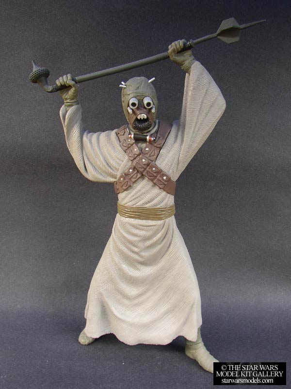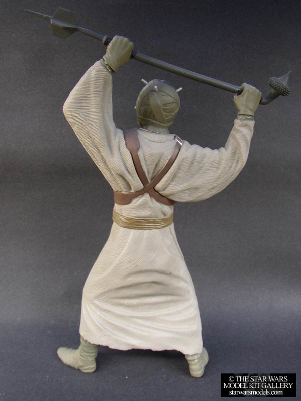 This is the oddball of the Polydata line. I say it is the oddball because all of the other kits are of main characters, and here you have a Tusken Raider. Strange choice, but I'm not going to complain because it looks cool! The Polydata kits are pre-painted so all you need to do is glue them together. The vinyl is very, very soft and cuts very easily without warming. Just be careful not to cut too much! Go slow. This kit went together fairly well, but I have always had trouble making it stand straight. I think it is the angle that I attached the feet to the ankles. Do a lot of dry fitting to check yours so you don't suffer the same fate as mine. It fell at least twice taking a few models with it. I have since taken it off of the clear pads that it comes with and tried to fix the feet. I achieved moderate success so it probably isn't a flaw in the kit. Like I said, just check it. Other than that, that's it. No painting is necessary, unless you want to. I got this kit off Yahoo! auctions for about $10. |