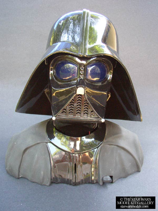 This has definitely got to be one of the strangest kits I have. A big plastic bust of Darth Vader that has glowing eyes and rasping breath! When actually the light bulb blew out as soon as I turned it on and the "rasping breath" is hard bristles that rub against a plastic disc. It's a product of the 70s, what do you want? Heh, heh. Anyway, construction was really simple. There was a pretty big seam along the shoulders and right down the middle of the helmet. These were easily fixed. A lot of the pieces were really warped because it was so old, so some coaxing was needed to fit them. It was kind of fun to play with the helmet. If you stuck it on a little kid's head, you'd have a mini-Vader! The mechanics and electronics were difficult because they too were really old. Some day, I'll replace them with new ones. I don't know why, but the bulb blew out instantly. It got super bright and POP! Maybe when this kit was made, batteries were really weak compared to today's. Painting on this kit was simple enough; flat black and gloss black with a twist--eh I mean touch of silver. I got this kit for around $10 off eBay. |