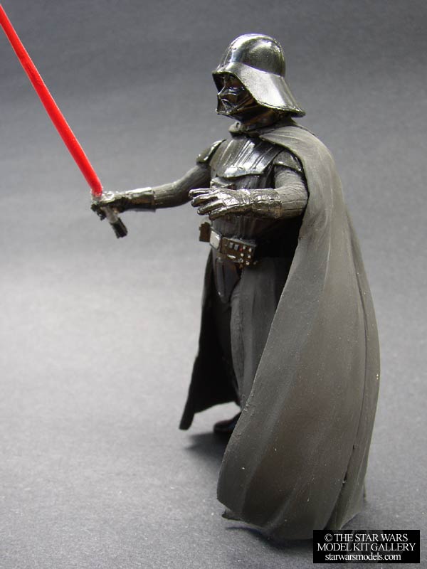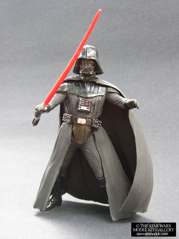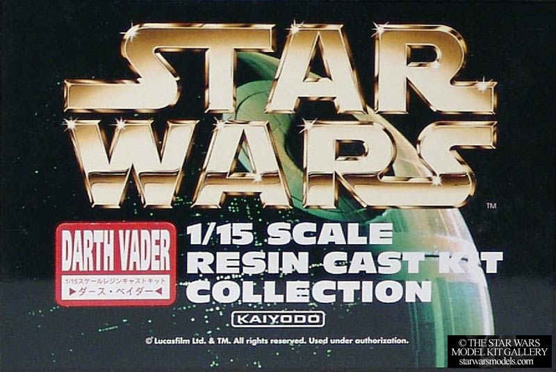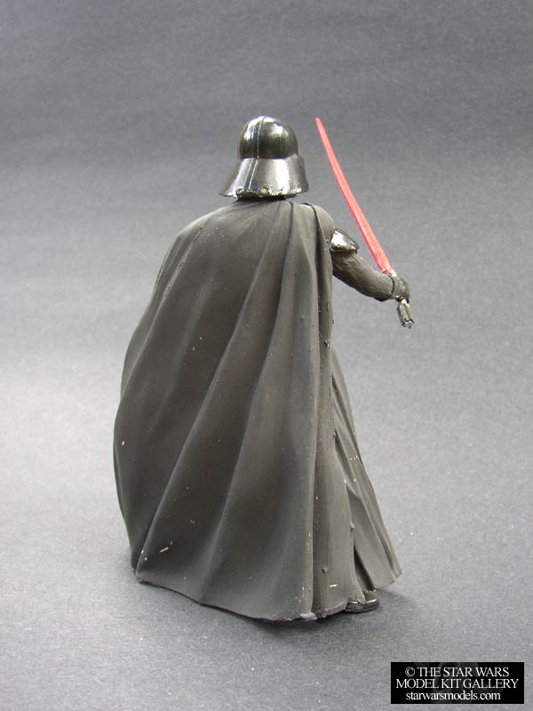 | This small Vader kit is part of the 1/15 Scale Resin Cast Kit Collection by Kaiyodo. This kit is just like any other Vader kit, except this one doesn't have any form of removable helmet. The lightsaber blade was horribly warped and needed some fixing. Someday I'll replace it. The cape on this kit is difficult to attach as it tends to touch the ground depending on his stance. His "skirt" had the same problem and didn't really fit very well. The back of his helmet had some pretty bad air bubbles. Everything else went ok. I painted him in gloss and flat black with the details of varying colors. After doing write ups for several Vaders, little is left to say. I got this for around $15 on eBay. |