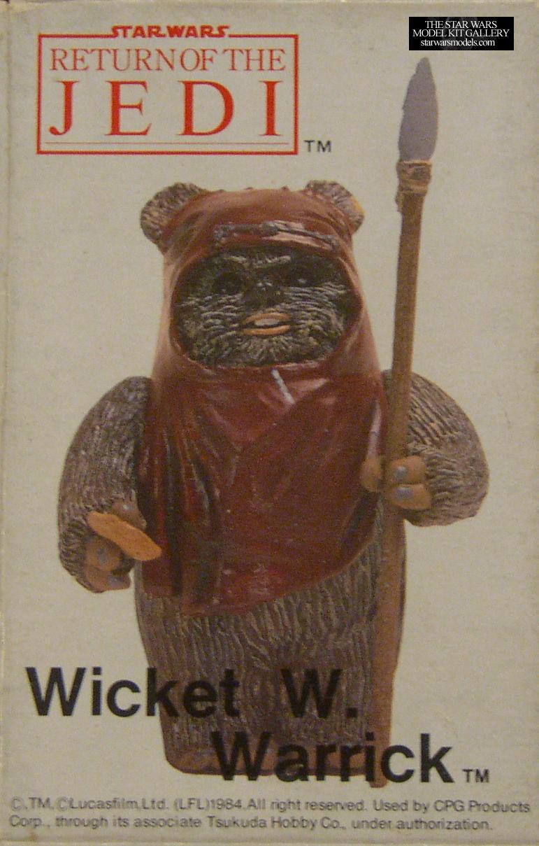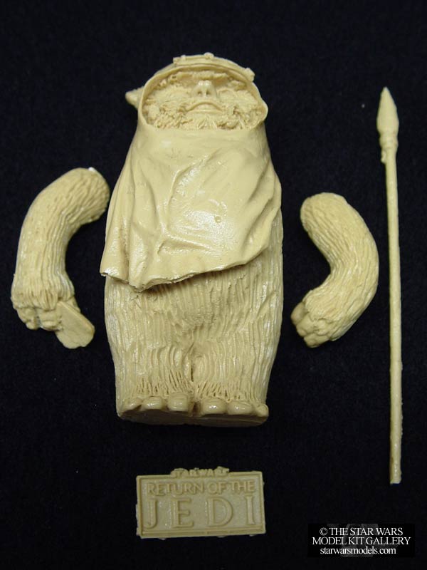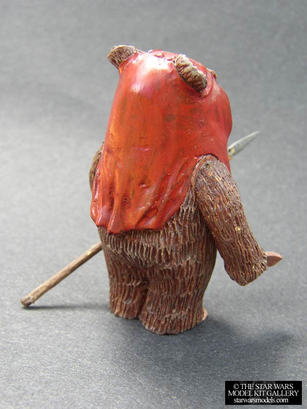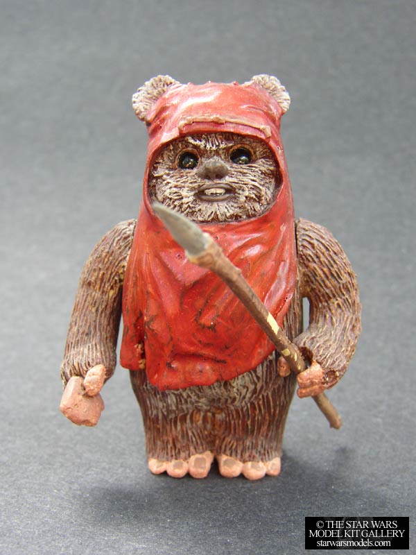 | My girlfriend absolutely loves this kit. She thinks it is "cute". It's probably Wicket's teddy bear-like nature and those big black eyes. Well, I think he's tough! I bet Jar-Jar couldn't do what he did! This kit was really fun to build. Figure kits are a nice change from ships sometimes. I think this kit had like about 4 main pieces, the body, the arms and the spear so there isn't much assembly to speak of. For painting, I based the kit in a medium/dark brown color and dry brushed increasingly lighter shades of brown over it. I especially concentrated on his face and ears where the real costume was lightest. Next I painted his hood/vest/cape thingy a reddish color. I probably should have done orange. I don't really know why I chose red. I then dirtied it up with some dark brown/black dry brushing. I picked out the details of his face with dark brown, white and gloss black. His "cookie" was painted a chocolate brown color and the spear was based in light brown and dry brushed with dark browns. I finished it off by painting his spear tip a medium gray color to replicate stone. All in all a nice little kit that everyone can enjoy. I got this for about $15 on eBay. |